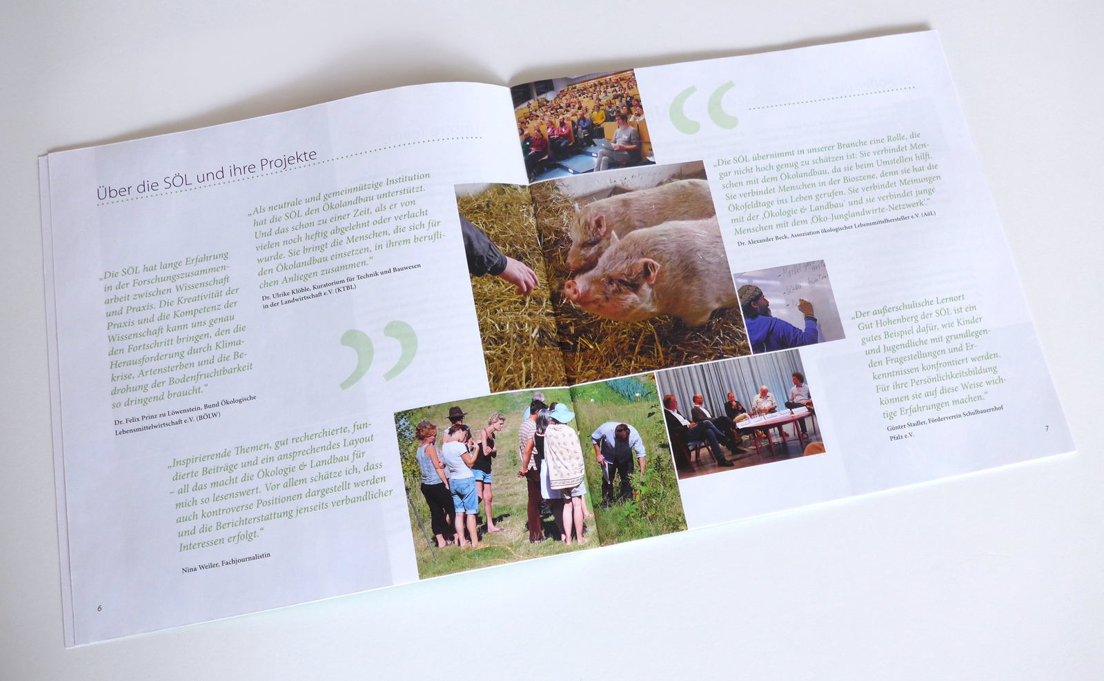 Der Projektebericht war erstmalig zu erstellen. Basierend auf dem bereits vorhandenen Erscheinungsbild der SÖL habe ich also das Design für ein neues, quadratisches Heftformat entwickelt.